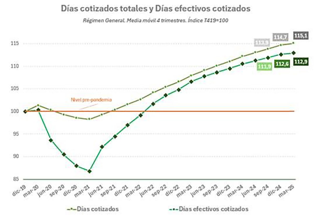 Los días efectivos trabajados han aumentado un 12,9% en el primer trimestre de 2025 en comparación con periodos anteriores.