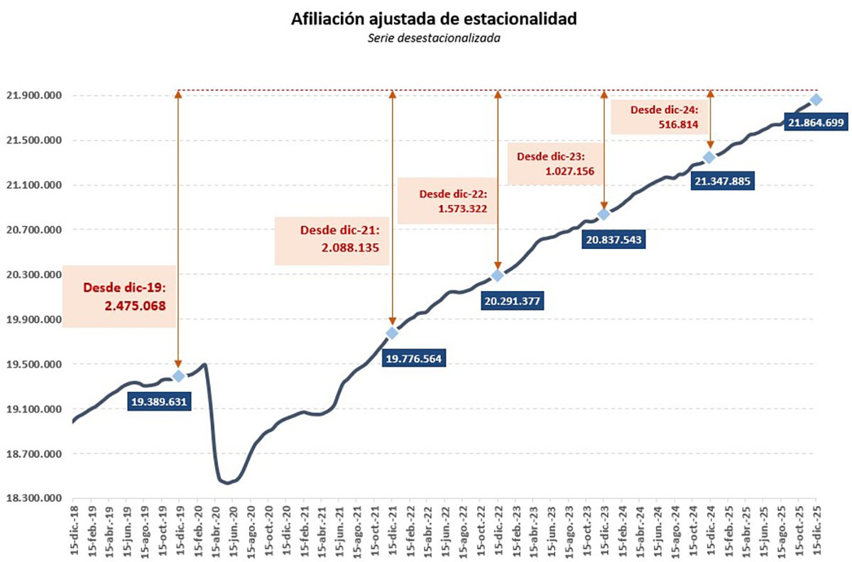 El día 11 de diciembre se superaron los 21,9 millones de afiliados, alcanzando específicamente 21.902.792 afiliados a la Seguridad Social.
